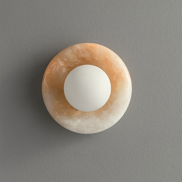 Clean and refined, this Round Bulgari Marble LED Wall Lamp features a white jade stone base paired with a frost glass shade. The soft white tones enhance brightness while maintaining a calm, luxurious feel. Measuring 20cm, it provides balanced illumination suitable for bedrooms, hallways, and bathrooms. The natural stone surface displays subtle variations, adding texture without overpowering the space. Perfect for minimalist, modern, and spa-inspired interiors, this wall lamp delivers timeless elegance and gentle ambient lighting.