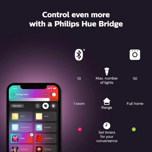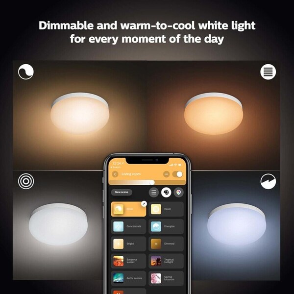 When you set up the Flourish ceiling lamp, you have almost instant access to smart lighting thanks to Bluetooth technology. Use the Philips Hue Bluetooth app to gain complete control over your lighting. Determine the mood yourself using the over 16 million available colours, dim your lighting, or use one of your favourite light scenes. The choice is yours.
