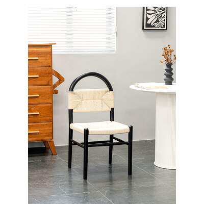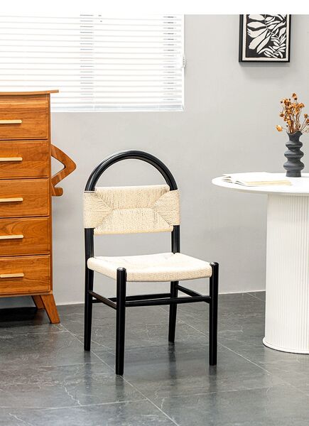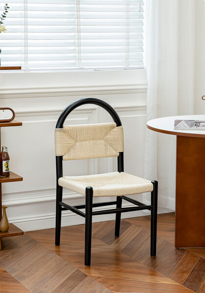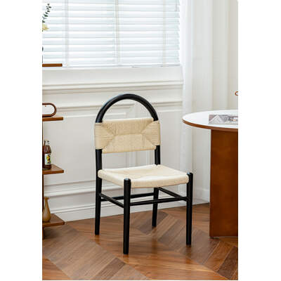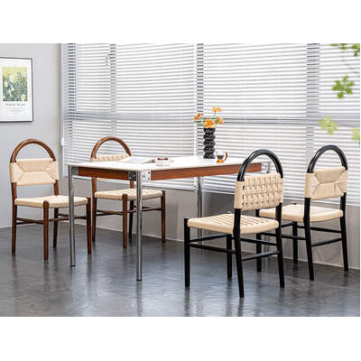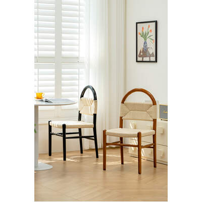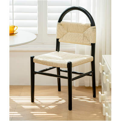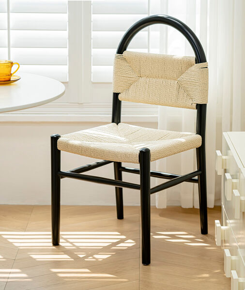The Vivan Dining Chair in Black Coated Teak with a stripe-pattern rattan rope seat delivers striking contrast and handcrafted charm. The dark timber frame grounds the design with a modern, sculptural presence, while the striped weave adds movement, texture, and visual interest.